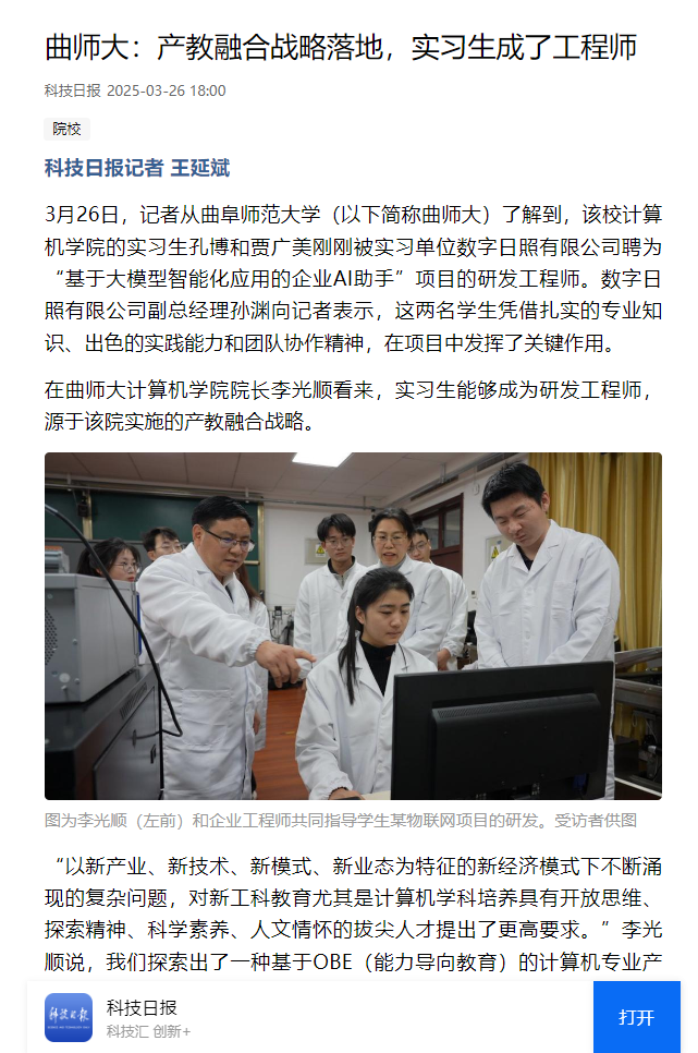 【科技日报】曲师大:产教融合战略落地,实习生成了工程师