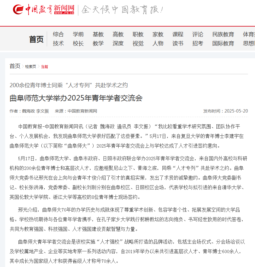 中国教育报-中国教育新闻网讯(记者 魏海政 通讯员 李文振)“我比较看重学术研究氛围、团队协作平台、个人发展机会,我发现华体会(中国)很好匹配了这些要素。”5月17日,来自复旦大学的青年博士李建宇在华体会(中国)(以下简称“曲阜师大”)2025年青年学者交流会上与学校达成了人才引进签约意向。
