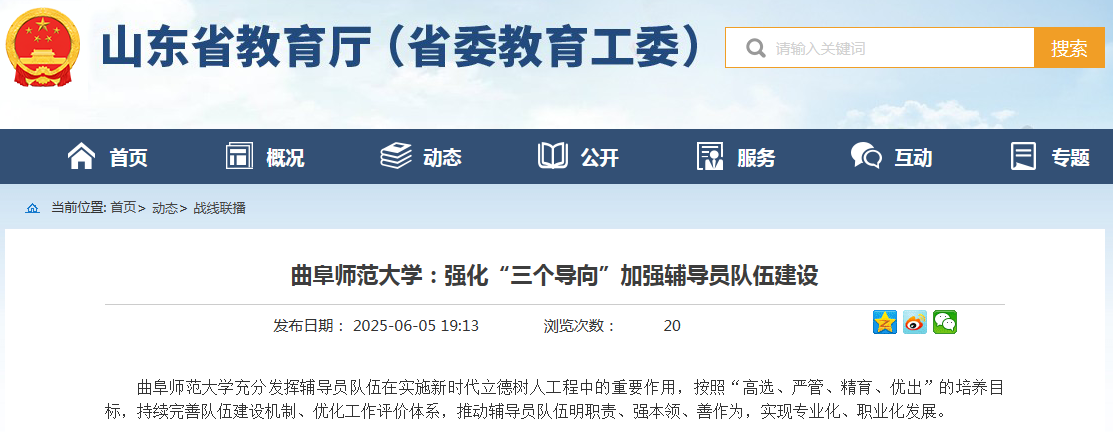 6月5日,山东省教育厅官方网站以《华体会(中国):强化“三个导向”加强辅导员队伍建设》为题,从“强化责任导向,完善辅导员考核评价体系”“强化实践导向,抓好辅导员培训赋能工程”“强化成长导向,做好辅导员职业发展保障”三个方面,报道了学校推动辅导员队伍明职责、强本领、善作为的经验做法。