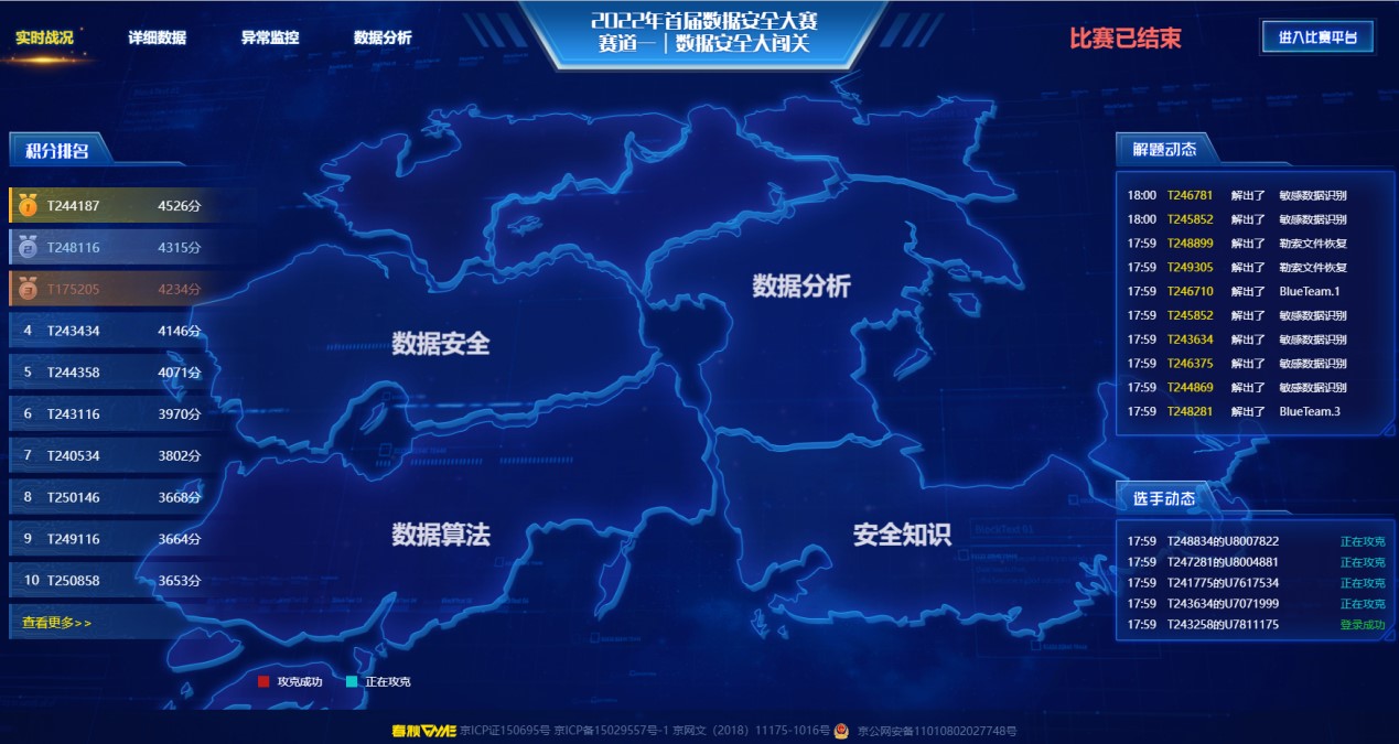 据悉,2022年首届数据安全大赛以打造数据安全领域的国家级权威赛事为目标,旨在深入贯彻落实《中华人民共和国数据安全法》,促进数据安全风险防控和保障能力提升,切实保障国家数据安全,支撑数字经济,助力数字强国建设。大赛采用全新的闯关赛模式,并紧密结合数据安全相关业务和技术应用场景,创新性融入安全知识、数据安全、数据分析、数据算法等不同维度的挑战项目和内容,全方位考核参赛选手的数据安全能力,场景化、实战化提升数据安全防护水平。晋级全国百强的队伍来自中国电信、国家电网等各行业领域单位,中兴、腾讯等专业技术公司,哈尔滨工业大学、北京邮电大学、电子科技大学、大连理工大学、华南理工大学、华体会(中国)等高校以及公安、海事、税务、气象等有关政府部门。