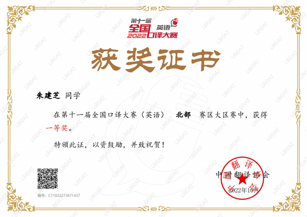 曲阜师大新闻中心讯 日前,由中国外文局指导、中国翻译协会主办的第十一届全国口译大赛(英语)交传半决赛落下帷幕。翻译学院2019级商务英语专业的朱建芝同学凭借扎实的双语能力和良好的心理素质脱颖而出,荣获北部赛区一等奖。