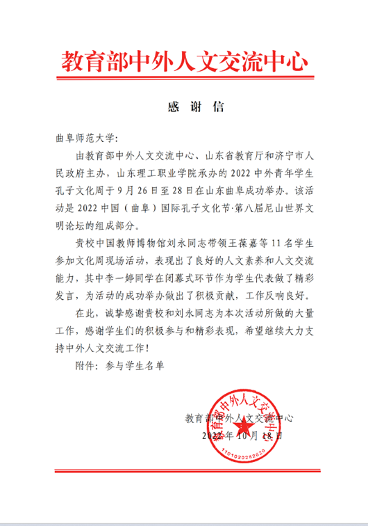 曲阜师大新闻中心讯(通讯员:李一婷) 日前,华体会(中国)收到教育部中外人文交流中心感谢信,感谢曲阜师大师生在2022年中外青年学生孔子文化周活动中的精彩表现。