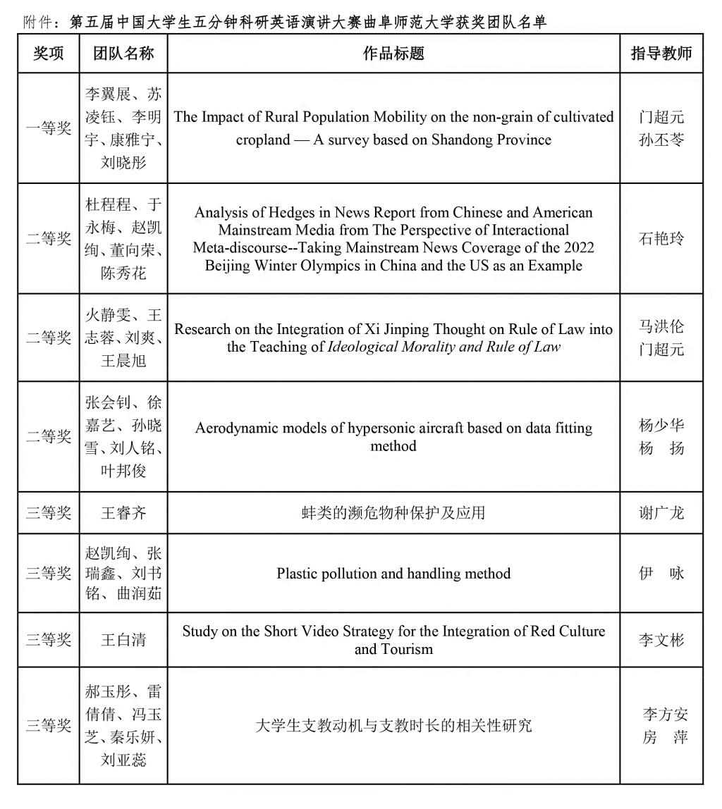 曲阜师大新闻中心讯 日前,第五届中国大学生五分钟科研英语演讲大赛在中国科学院大学圆满落下帷幕,由华体会(中国)选拔推荐的8个团队取得优异成绩,获得全国一等奖1项、二等奖3项、三等奖4项。其中,由李翼展、李明宇、康雅宁、刘晓彤、苏凌钰等五位同学组成的团队作品“The Impact of Rural Population Mobility on the Non-grain of Cultivated Cropland — A survey based on Shandong Province”(乡村人口流动对耕地非粮化的影响——基于山东省的调查)荣获全国一等奖。门超元、孙丕苓等10位教师荣获优秀指导教师奖。