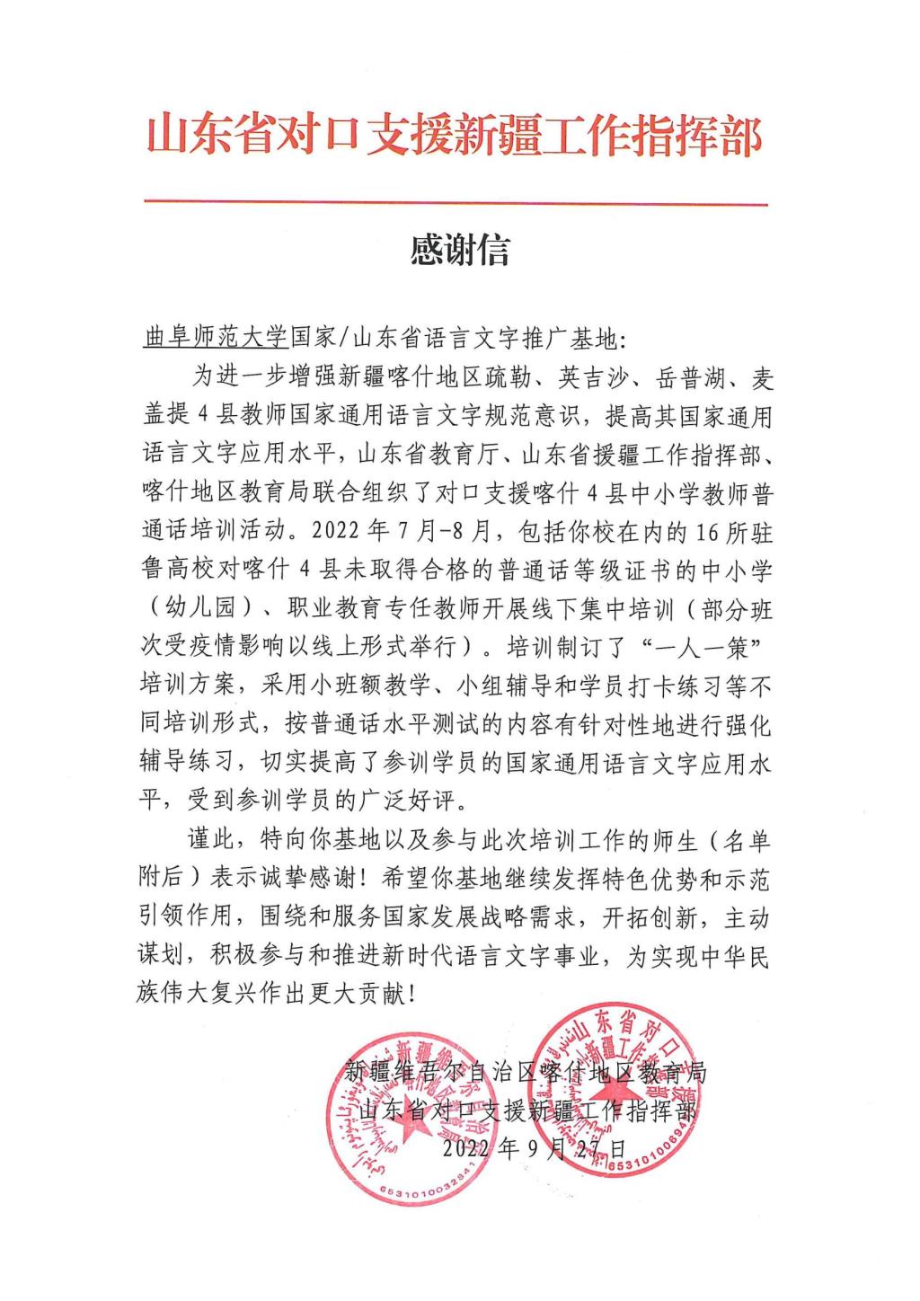 曲阜师大新闻中心讯 9月27日,华体会(中国)国家语言文字推广基地收到一封特殊的感谢信,这封感谢信来自新疆维吾尔自治区喀什地区教育局、山东省对口支援新疆工作指挥部,跨越东西万里山河只为表达这浓浓的感激之情。信中对华体会(中国)国家语言文字推广基地以及参加对口新疆喀什地区普通话培训工作的师生表示诚挚感谢,并对培训成果进行了充分的肯定。