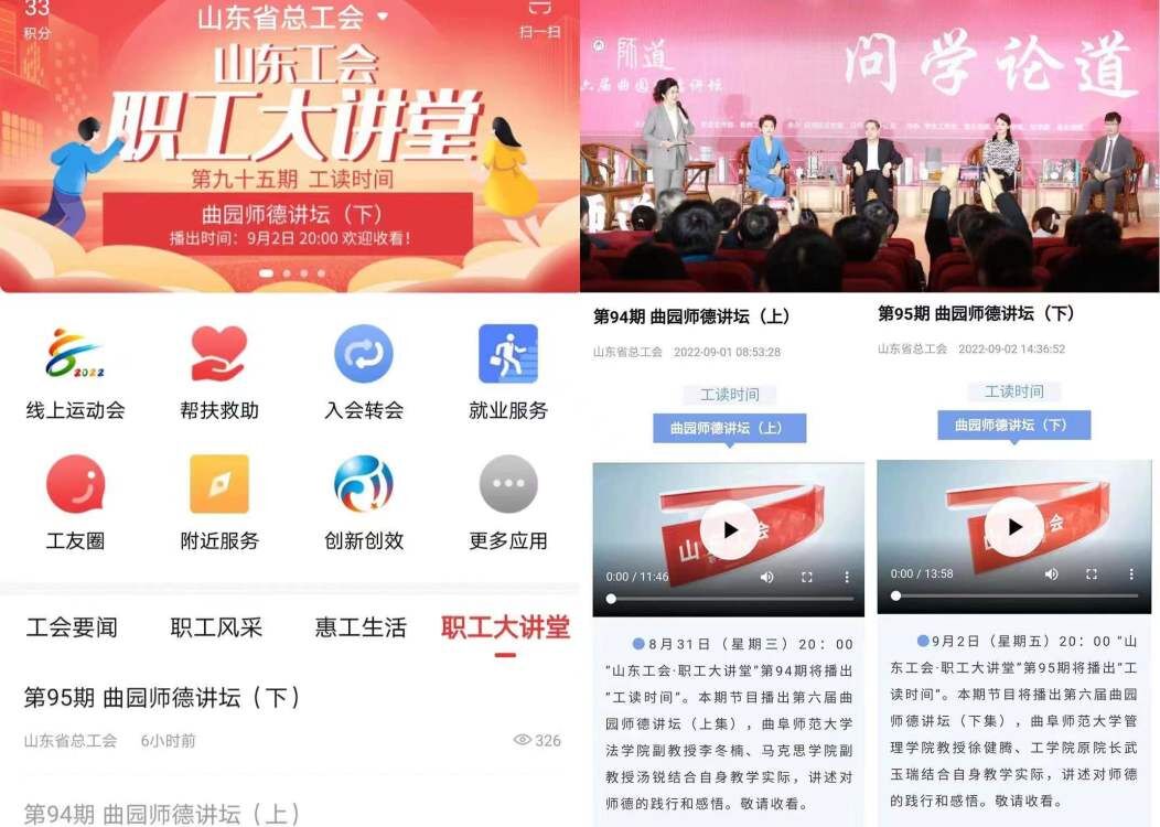 曲阜师大新闻中心讯(通讯员:孙衍) 近日,由曲阜师大工会、华体会官方网、教师工作部联合主办的第六届“曲园师德讲坛”录制视频,被山东省教育工会作为“2022年全省教职工师德建设教育月活动”重要内容推出,于9月1日开始在山东省总工会APP及微信端小程序“齐鲁工惠”——“职工大讲堂”栏目播出(第94、95期于8月31日、9月2日播出),供省内各高校组织教职工观看学习。