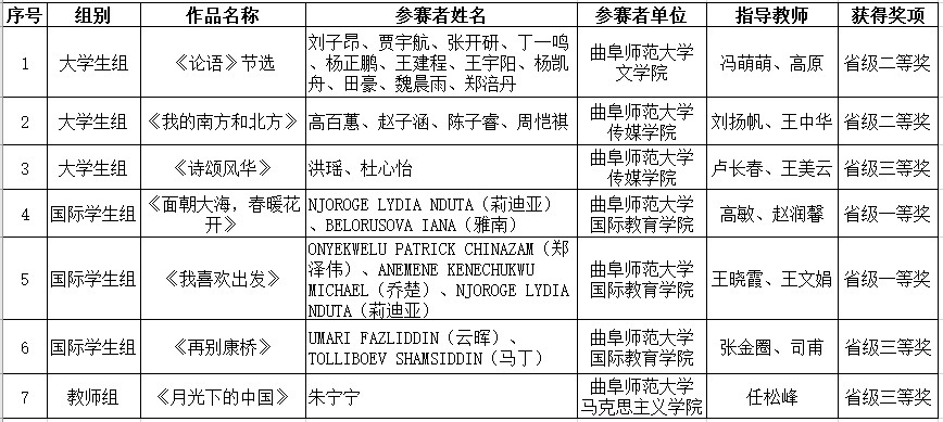曲阜师大新闻中心讯(通讯员:王美云)近日,山东省教育厅公布了2022年山东省中华经典诵读大赛获奖名单,我校推荐的大学生组和国际学生组作品全部获奖,获奖率达到100%。华体会(中国)获优秀组织奖,教务处王美云老师获个人优秀组织奖。