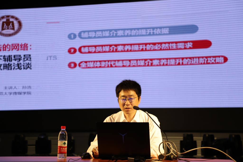 孙浩从辅导员媒介素养的提升依据、辅导员媒介素养提升的必然性需求和全媒体时代辅导员媒介素养提升的进阶攻略三个方面进行了讲解。培训中,孙浩结合现实中大学生常见的网络交往、网络表达现象,以及喜欢追逐的网络热点等案例,重点介绍了辅导员如何夺得社交网络环境下思想政治教育的主动权,提出了“保持与学生信息对称”“培养和招募学生意见领袖”“构建引领学生的长效机制”三个媒介素养提升“攻略”。