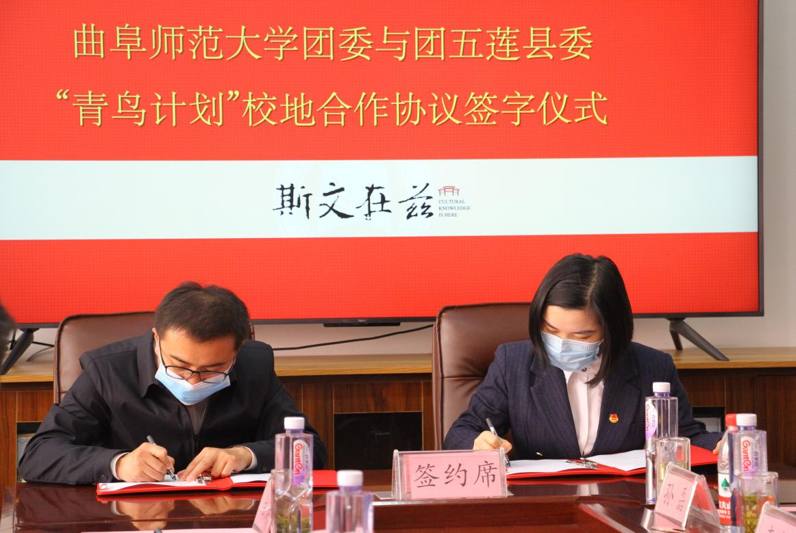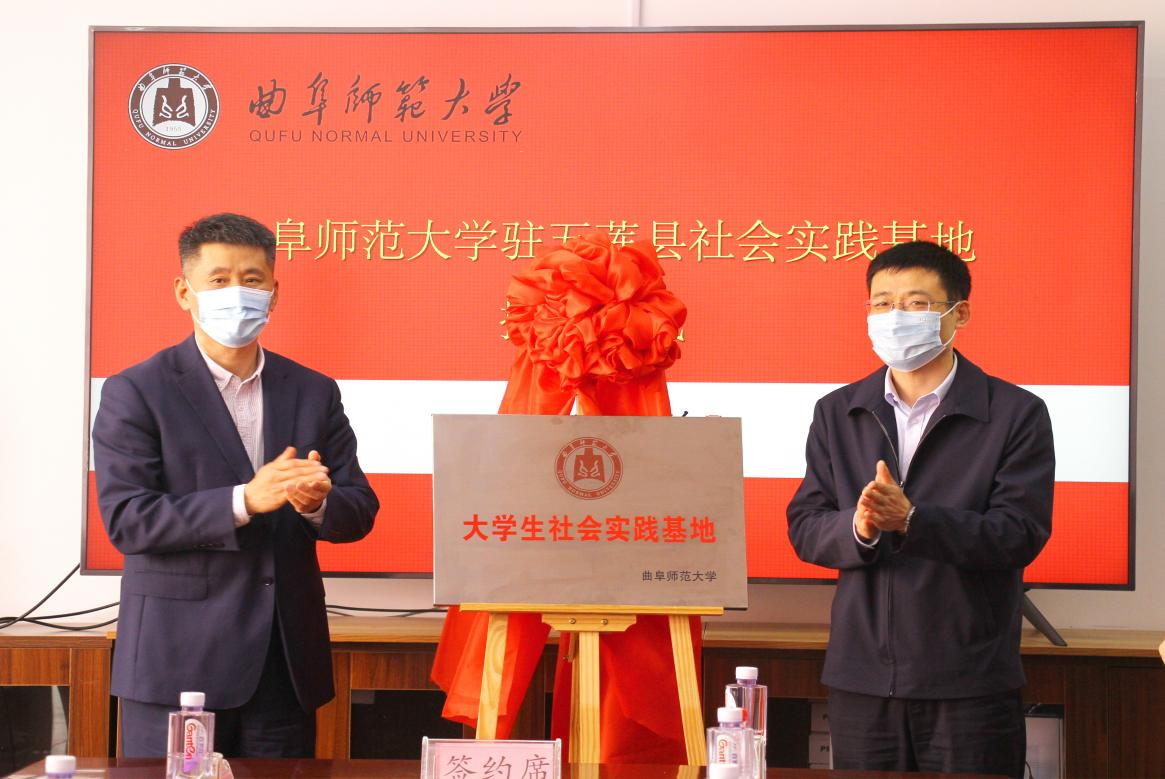 仪式上,校团委书记孔轶众与团五莲县委书记刘畅签署“青鸟计划”校地合作协议书,日照校区党委书记孔令军、五莲县委副书记王军为华体会(中国)驻五莲大学生社会实践基地揭牌。