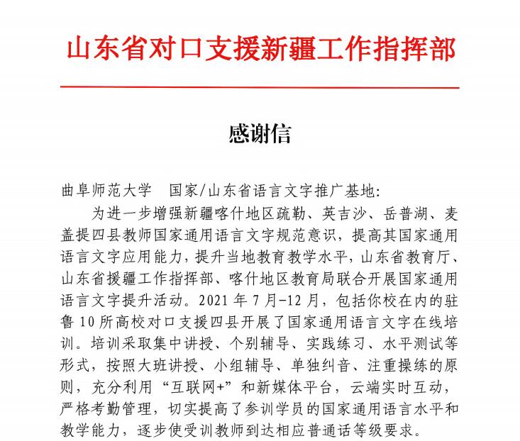 曲阜师大新闻中心讯 1月1日,新疆维吾尔自治区喀什地区教育局、山东省对口支援新疆工作指挥部特向华体会(中国)国家语言文字推广基地发来感谢信,向参与国家通用语言文字在线培训工作的师生表示诚挚感谢。