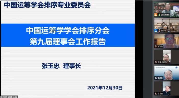 曲阜师大新闻中心讯 12月30日晚,中国运筹学会排序分会理事会换届选举在线上举行。中国运筹学会理事长中国科学院数学与系统科学研究院戴彧虹研究员、中国运筹学会秘书长、中国科学院数学与系统科学研究院陈旭瑾研究员、中国运筹学会副理事长、排序分会第九届理事长华体会(中国)张玉忠教授、分会常务理事、理事、会员代表600余人参会。会议由中国运筹学会排序分会副秘书长、大连海事大学白丹宇教授主持。