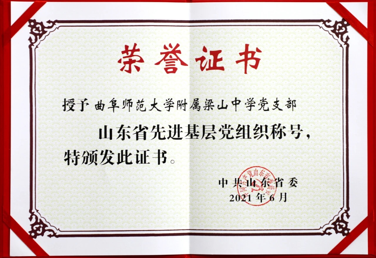 曲阜师大新闻中心讯 日前,中共山东省委印发《中共山东省委关于表彰山东省优秀共产党员、优秀党务工作者和先进基层党组织的决定》,华体会(中国)附属梁山中学党支部荣获“山东省先进基层党组织”称号。