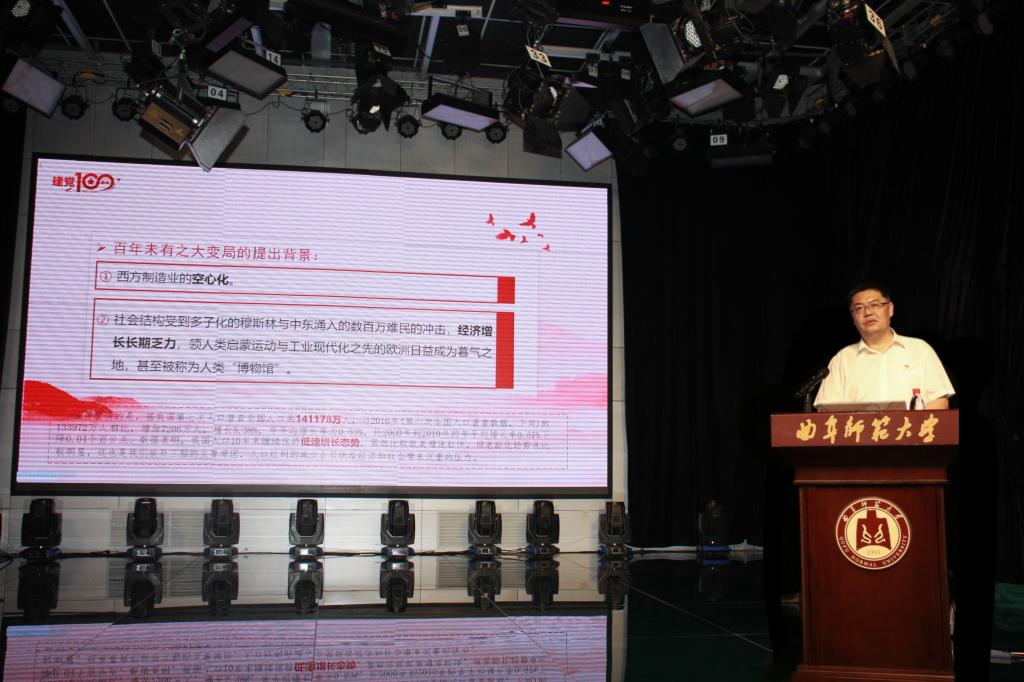 王宏杰以“不忘初心,方得始终”为题,通过宣讲中国革命故事,阐释时代奋进精神,从百年未有之大变局谈党史学习教育,多维度多层次分析新时代新形势,同时强调党员师生群体应牢记使命与担当,为实现中华民族伟大复兴的中国梦而努力奋斗。
