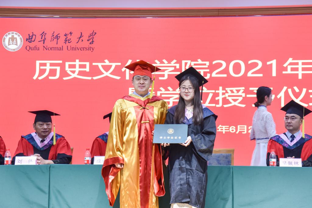 曲阜师大新闻中心讯   六月芳华,曲园骊歌。6月25日上午,历史文化学院2021年毕业典礼如期举行,学校党委书记、博士生导师戚万学教授应邀出席典礼并为毕业生代表拨穗正冠、颁授证书。384名本科生和60名硕士研究生如约齐聚孔子会堂,共赴这场曲园青春之约。学校党委办公室负责人、学院领导班子、博士生导师、教师代表、家长代表共同参加典礼。学院副院长吕厚轩主持典礼,副院长王京传教授宣读了关于授予学位的决定。