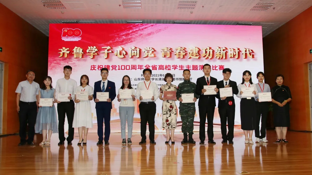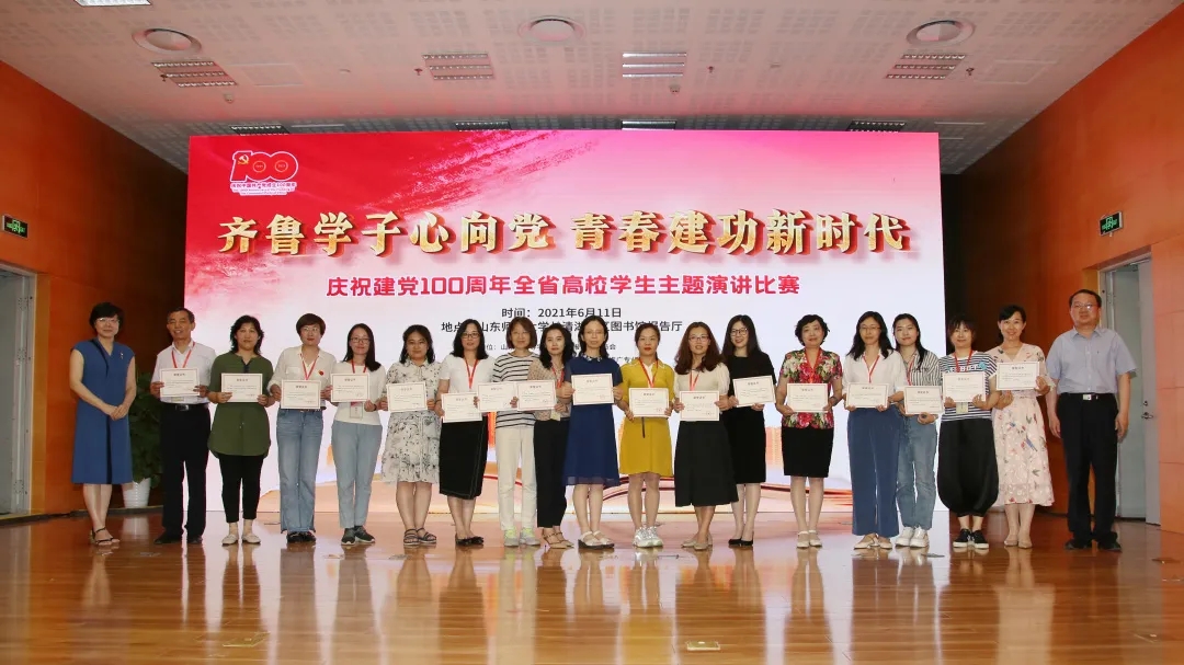 6月11日,“齐鲁学子心向党 青春建功新时代”庆祝建党100周年全省高校学生主题演讲比赛决赛活动在山东师范大学举办。此次活动由山东省高校图工委主办,山东师范大学、青岛大学承办,来自全省35所高校的35名选手进入决赛,同台竞技。经过一天紧张的比赛,评选出一等奖5名,二等奖12名,三等奖18名;最佳指导教师奖17名,优秀指导教师18名;优秀组织奖18名。