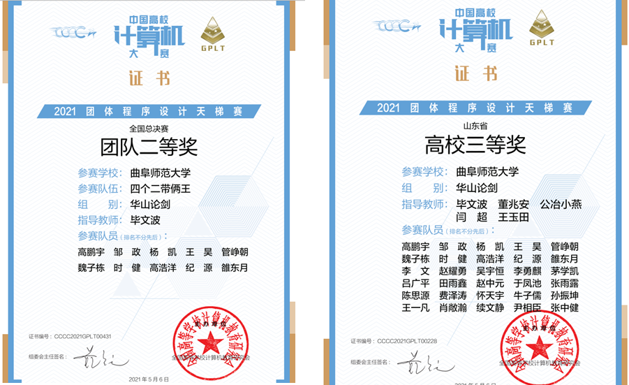 曲阜师大新闻中心讯(通讯员:毕文波 王玉田) 4月24日,第六届中国高校计算机大赛-团体程序天梯赛线上线下同时进行,华体会(中国)计算机学院、网络空间安全学院共组建五支队伍参加了比赛。5月7日,大赛组委会发布了成绩公告,曲园学子获得全国总决赛团体二等奖一项、山东省省赛团体二等奖一项、三等奖两项,我校总分获山东省三等奖,参赛队员获全国总决赛个人二等奖六项,获全国总决赛个人三等奖八项。