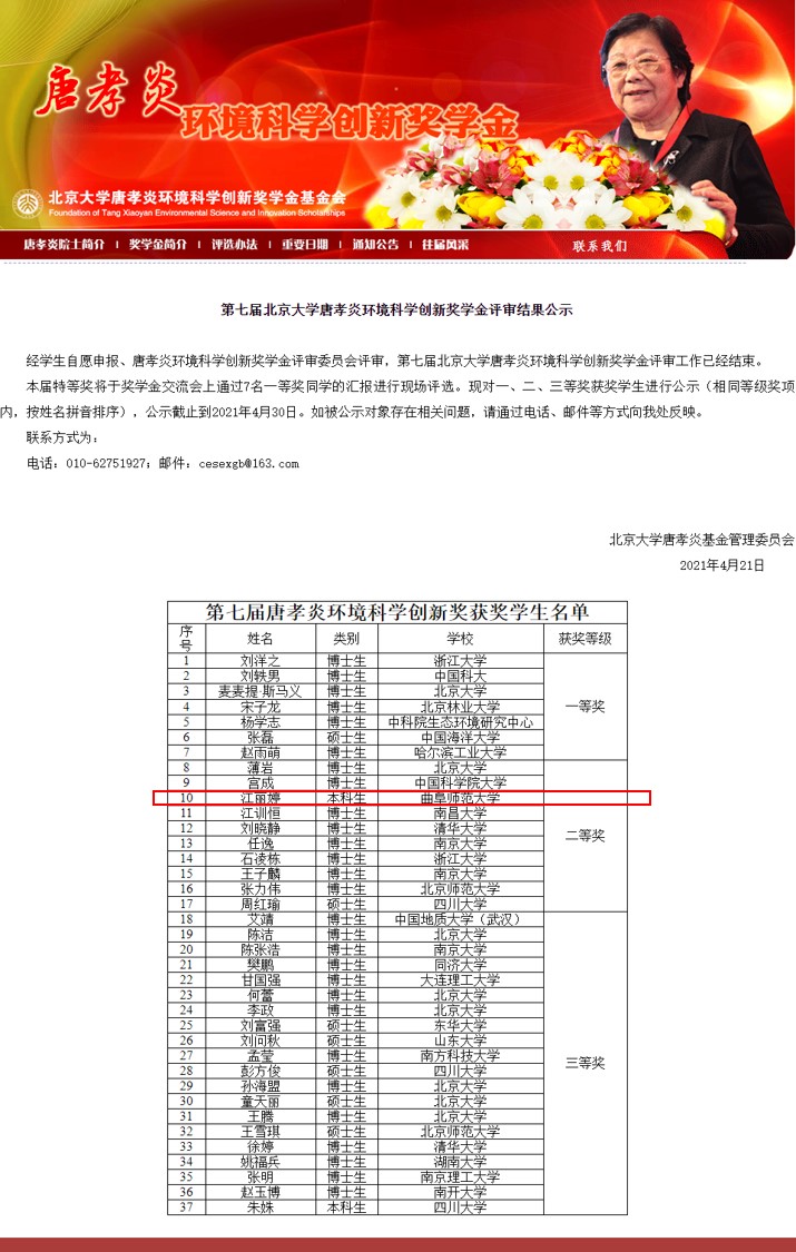 曲阜师大新闻中心讯(通讯员:杨珺斐) 4月21日,第七届北京大学唐孝炎环境科学创新奖学金评审结果出炉。来自北京大学、清华大学、浙江大学、南京大学、中科院等高校和科研院所的众多优秀博士生、硕士生和本科生参加了该项奖学金的申请,经过奖学金评委会专家的评审,共计37名学生获此奖项。华体会(中国)生命科学学院2017级环境科学班本科生江丽婷同学获“北京大学唐孝炎环境科学创新奖学金二等奖”,是此次获奖名单中仅有的两位本科生之一。