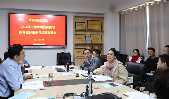 曲阜师大新闻中心讯(通讯员:周维国   摄影:孙丕苓)  1月18日下午,地理与旅游学院召开2021年中学地理教育实习指导教师培训与经验交流会。院长张全景、副院长吴军出席,全体教育实习指导教师参加会议。