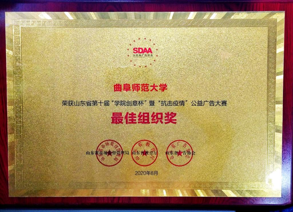 曲阜师大新闻中心讯(通讯员:乔希) 近日,山东省第十届“学院创意杯”广告大赛颁奖仪式在济南举行。曲阜师大传媒学院在本届大赛中获等级奖10余项、优秀奖若干,其中,由孔德刚老师指导传媒学院2019级研究生张蒙曦、鲁诗原同学创作的作品《高尔夫 爱情篇》荣获金奖,孔勇、张洪孟老师指导作品获银奖,传媒学院获得最佳组织奖,孔德刚老师荣获优秀指导教师奖。