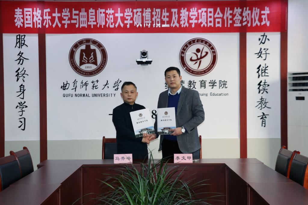 曲阜师大新闻中心讯(通讯员:邢春雷)  2020年12月31日下午,曲阜师大继续教育学院与泰国格乐大学举行硕博招生及教学项目合作签约仪式,院长马秀峰、副院长邢春雷、自考培训部长杨来舜,泰国格乐大学淮海国际事务中心主任李文甲出席签约仪式,副院长邢春雷主持仪式。