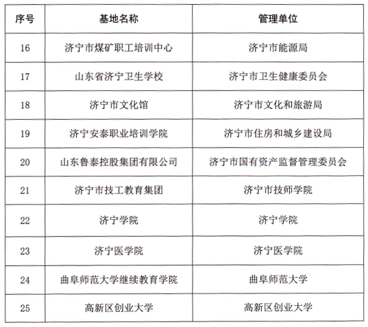 济宁市专业技术人员继续教育基地是经市人力资源社会保障局遴选,以对专业技术人员进行补充、更新知识,拓展知识结构,提高综合素质和创新能力为基本内容开展教育培训的机构,是济宁市培养培训高层次、急需紧缺和骨干专业技术人才的市级服务平台。市级继续教育基地坚持统一规划、分批建设、示范引领、资源共享的原则,围绕全市经济社会发展需求,紧跟世界科技发展前沿开展专业技术人员继续教育。申报市级继续教育基地的单位应具有丰富的教育培训经验,在本地区、本行业具有一定影响,并具备充分的继续教育培训条件。