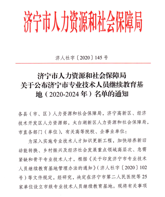 曲阜师大新闻中心讯(通讯员:邢春雷) 近日,《济宁市人力资源和社会保障局关于公布济宁市专业技术人员继续教育基地( 2020-2024年)名单的通知》(济人社字[2020]145号)已经下发,曲阜师大继续教育学院获批济宁市专业技术人员继续教育基地。