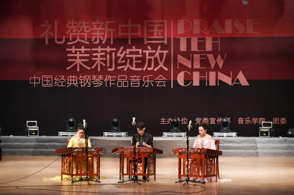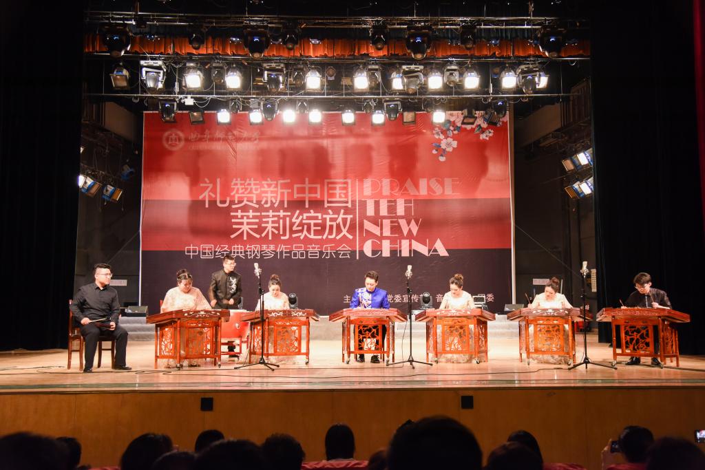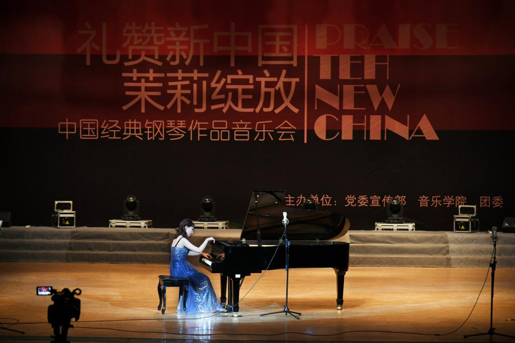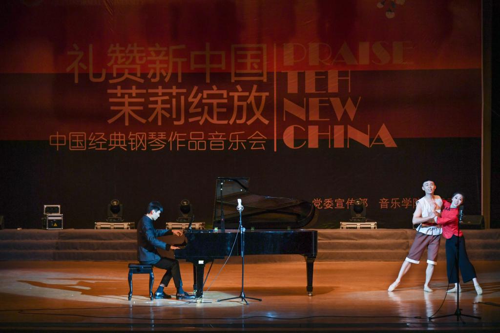音乐会分为“礼赞新中国”和“奋进新时代”两个乐章。在《钢琴与诗》的伴奏中音乐会缓缓拉开序幕,悠扬婉转的钢琴曲与激情饱满的诗朗诵带领全场观众回顾了新中国的恢弘巨变与全面腾飞;一首《松花江上》跌宕起伏、扣人心扉,1931年东北地区的紧张战事如在全场观众眼前;钢琴演奏《山丹丹花开红艳艳》与动人的舞蹈巧妙结合,将陕北人民朝气乐观的精神面貌展现得淋漓尽致;由《解放区的天》《南海小哨兵》改编而成的钢琴曲节奏明快、浑厚饱满,歌颂了中国共产党的领导,赞扬了少年儿童朝气蓬勃、机智勇敢的样貌;钢琴演奏《浏阳河》情感真挚,富有时代气息,抒发了一代代人民对祖国的感恩之情;扬琴合奏《引滦抒怀》音色明亮、清脆悦耳,赞颂了中国劳动人民利用自然、改造自然的伟大功绩,让全场观众沉醉其中。