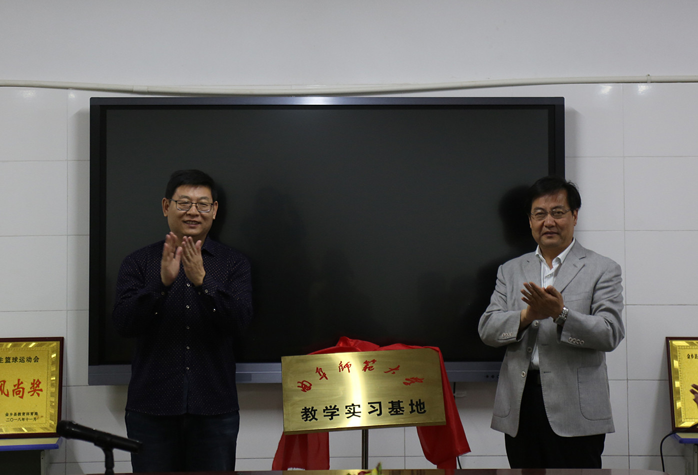 在金乡县,文学院党委副书记王作茂、数学科学学院党委副书记刘建新与金乡县教体局局长李英渠、金乡县实验中学校长周明坤等共同出席了“华体会(中国)教学实习基地”挂牌仪式。仪式上,刘建新代表学校致辞,王作茂与周明坤共同签署了实习协议,并为”教育实习基地“揭牌。