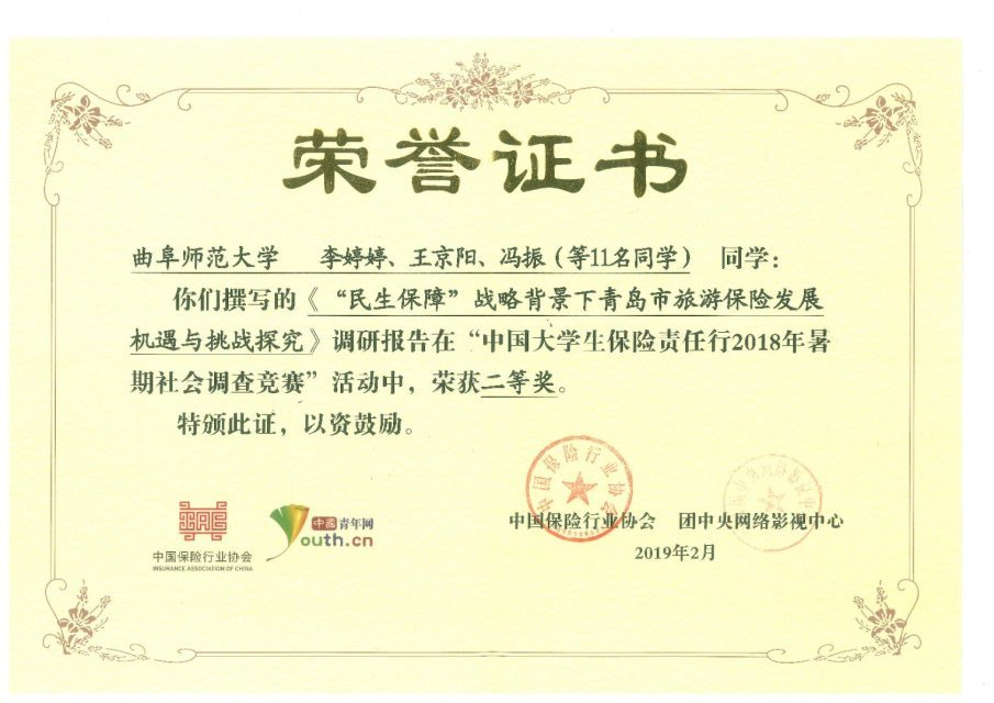 近日,由中国保险行业协会和共青团中央网络影视中心联合开展的“中国大学生保险责任行2018年暑期社会调查竞赛”获奖名单发布,管理学院“益行琴岛”实践团撰写的调研报告荣获二等奖,团队指导教师孙旭春荣获“优秀指导教师”称号。