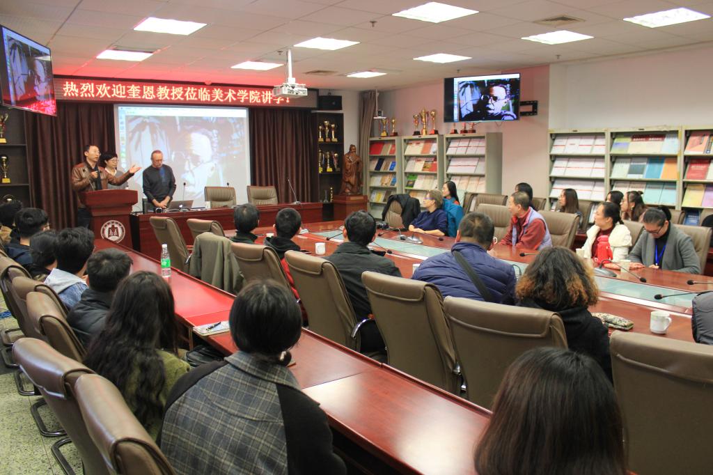 11月20日下午,中美具象油画教学论坛在我校举行,美国著名艺术家、拿撒勒大学教授詹姆斯.奎恩做主旨演讲,我校美术学院、临沂大学等高校的部分教师和研究生参加了论坛。论坛由我校美术学院院长李善阳教授主持。