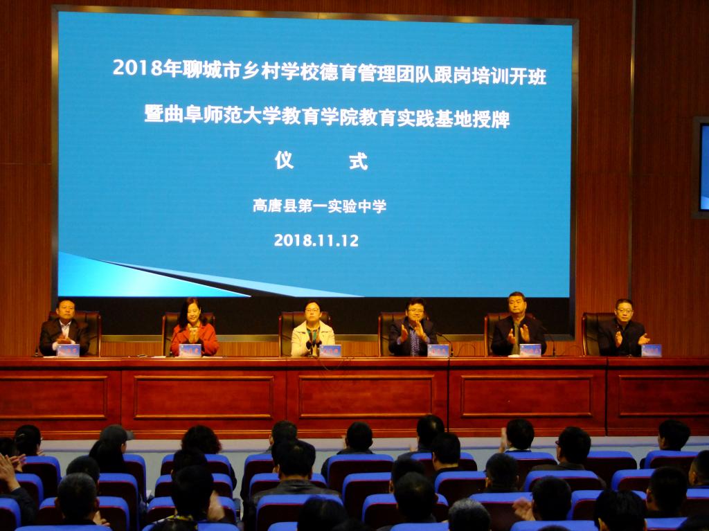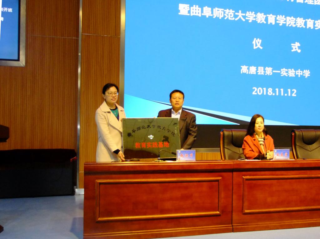 11月12日,教育学院教育实践基地落户聊城市高唐县第一实验中学,学院党委书记姜美颖与高唐县第一实验中学校长赵洪军共同为基地揭牌。院长唐爱民,办公室主任王连生,高唐县教育局副局长宋传志,高唐县进修中心学校副校长、教育局职教科科长王美霞,以及高唐县第一实验中学的师生参加了基地揭牌仪式。