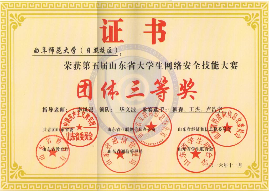 山东省大学生网络信息安全技能大赛由共青团山东省委、山东省经信委、山东省教育厅等单位联合举办,目的在于在大学生中普及网络安全知识,提高大学生网络安全技能,培养高水平的网络安全技能人才,提高山东高校的教学水平并提升山东省互联网信息安全水平,到今年已经举办了五届,每所高校选送一支队伍代表学校参加比赛,每支队伍成员三人。