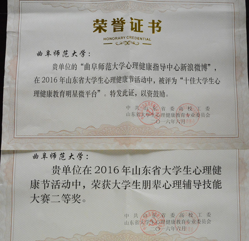 我校被评为“山东省2016年大学生心理健康节优秀组织单位”,荣获山东省高校大学生朋辈心理辅导技能大赛二等奖,心理健康指导中心新浪微博被评为“山东省高校十佳大学生心理健康教育明星微平台”,陈学宁、刘蓉老师的论文《特殊群体大学生归因方式对主观幸福感影响研究》获心理健康优秀论文一等奖,李凯老师的论文《微时代背景下大学生政治心理的培养与优化》、刘蓉老师的论文《面向“橄榄型”社会的大学生社会定位积极心态塑造研究》获心理健康优秀论文三等奖,心理DV剧作品《别跟我说话》获得心理情景短剧DV大赛三等奖。
