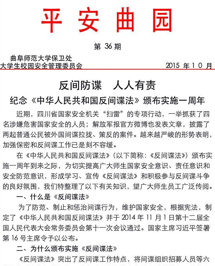 保卫处根据《反间谍法》的主要内容制作了宣传光碟材料,分发到各学院、各单位,以便各单位组织集中学习宣传;在学校安全教育微信公众号《平安曲园》发布了纪念《反间谍法》颁布一周年专题;编辑了《平安曲园》纪念《反间谍法》颁布一周年专刊,并在校内微信公众号、QQ群等新媒体进行电子版推送。此外,还通过学校电子宣传板对《反间谍法》进行了宣传。各单位也组织了以观看宣传光碟、学习宣传材料为主要内容的专题学习活动。