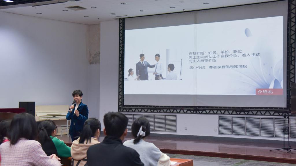 会上,宋志方老师阐明了礼仪的释义以及培养礼仪素养的重要性,分别从仪容、仪表和仪态三方面讲述了如何塑造出色的礼仪形象,并且详细讲解了名片礼、迎接礼、问候礼等社会生活各方面礼仪的技巧和注意事项。最后,宋志方老师讲解并演示了播音、朗诵、解说的区别。本次培训会安排了交流、展示等互动环节,取得了良好的培训效果。