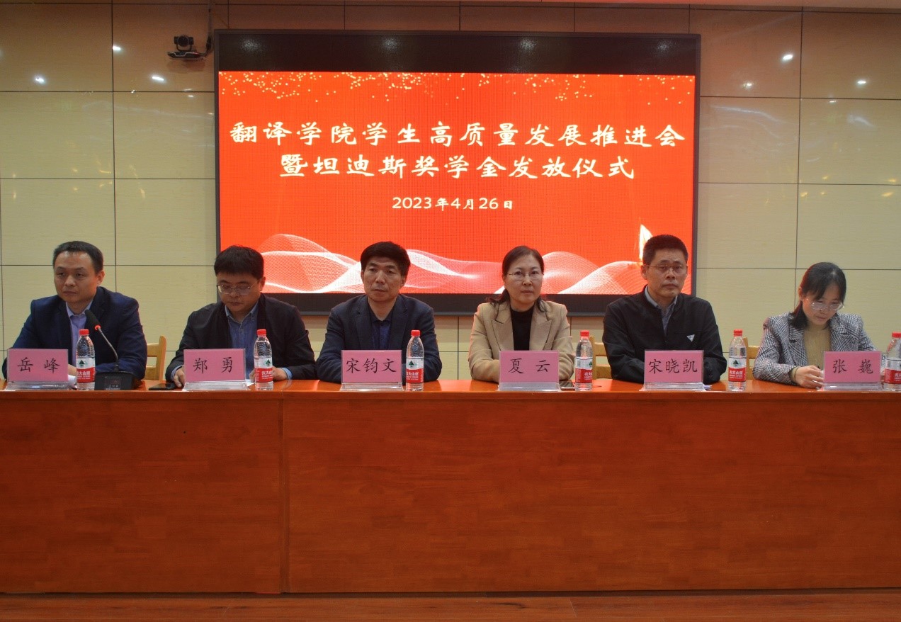 曲阜师大翻译学院讯 4月26日下午,翻译学院2023年学生高质量发展推进会暨坦迪斯奖学金发放仪式于图书馆报告厅举行。翻译学院党委书记宋钧文、院长夏云、学生工作处副处长郑勇、副院长宋晓凯、副教授张巍、全体辅导员出席仪式。学院党委副书记岳峰主持活动。