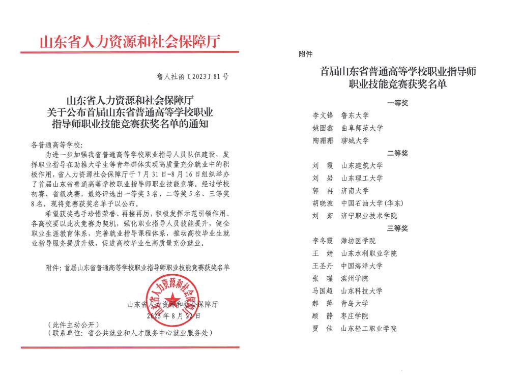 曲阜师大经济学院讯 近日,山东省人力资源和社会保障厅公布了首届山东省普通高校职业指导师职业技能竞赛获奖结果,经济学院姚圆鑫老师获得一等奖。
