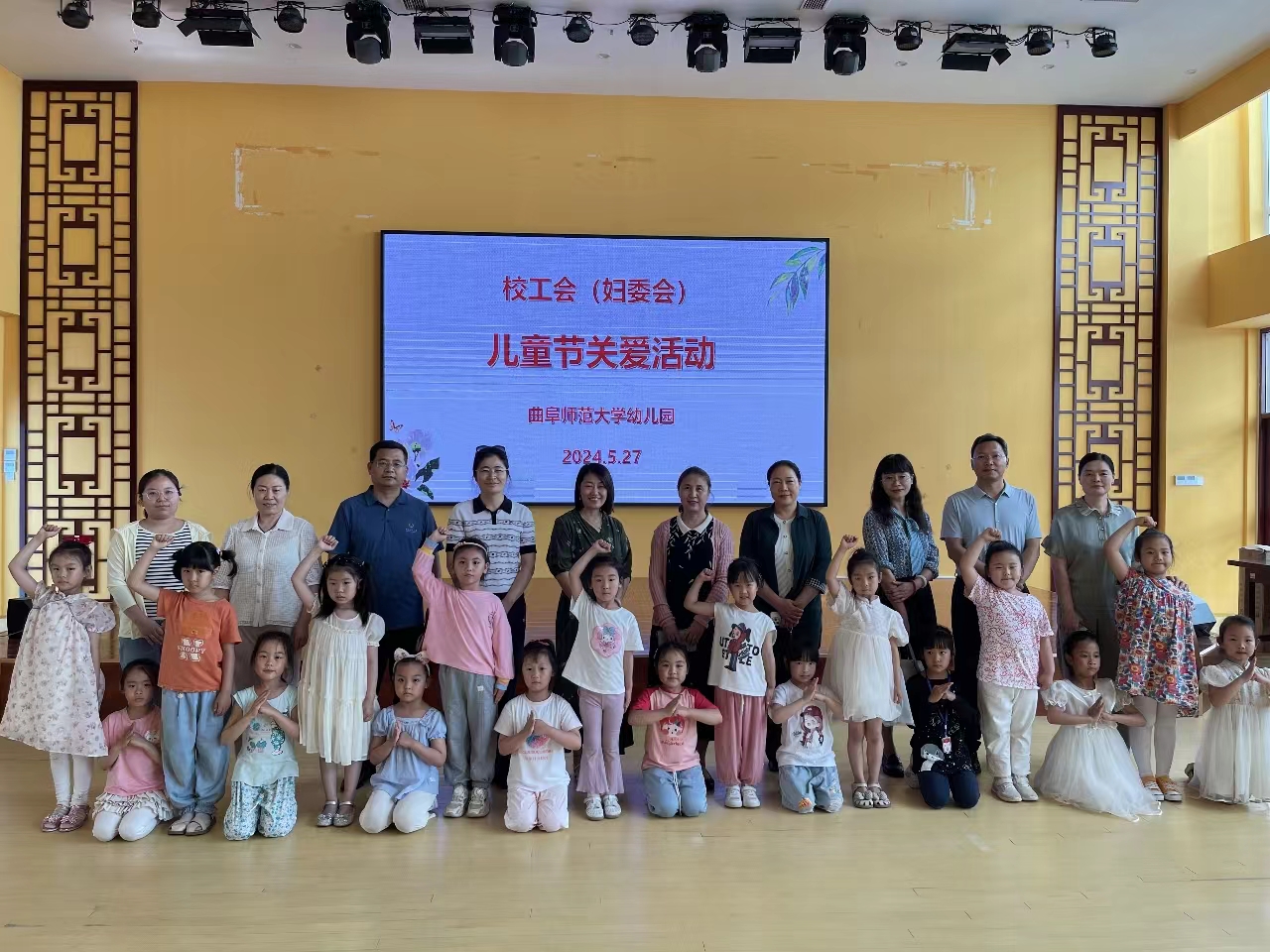 学校工会讯 5月27日下午,值第74个六一国际儿童节来临之际,校工会副主席兼妇委会主任刘英华、女工部部长孙玲、女教授联谊会会长王曰美、女教授联谊会关心下一代部部长刘丽、外国语学院工会主席高歌一行赴幼儿园走访慰问,向孩子们致以节日的祝福,向辛勤工作的园丁们表示衷心的感谢 。后勤管理处处长展利民、副处长祁世友参加了本次活动。