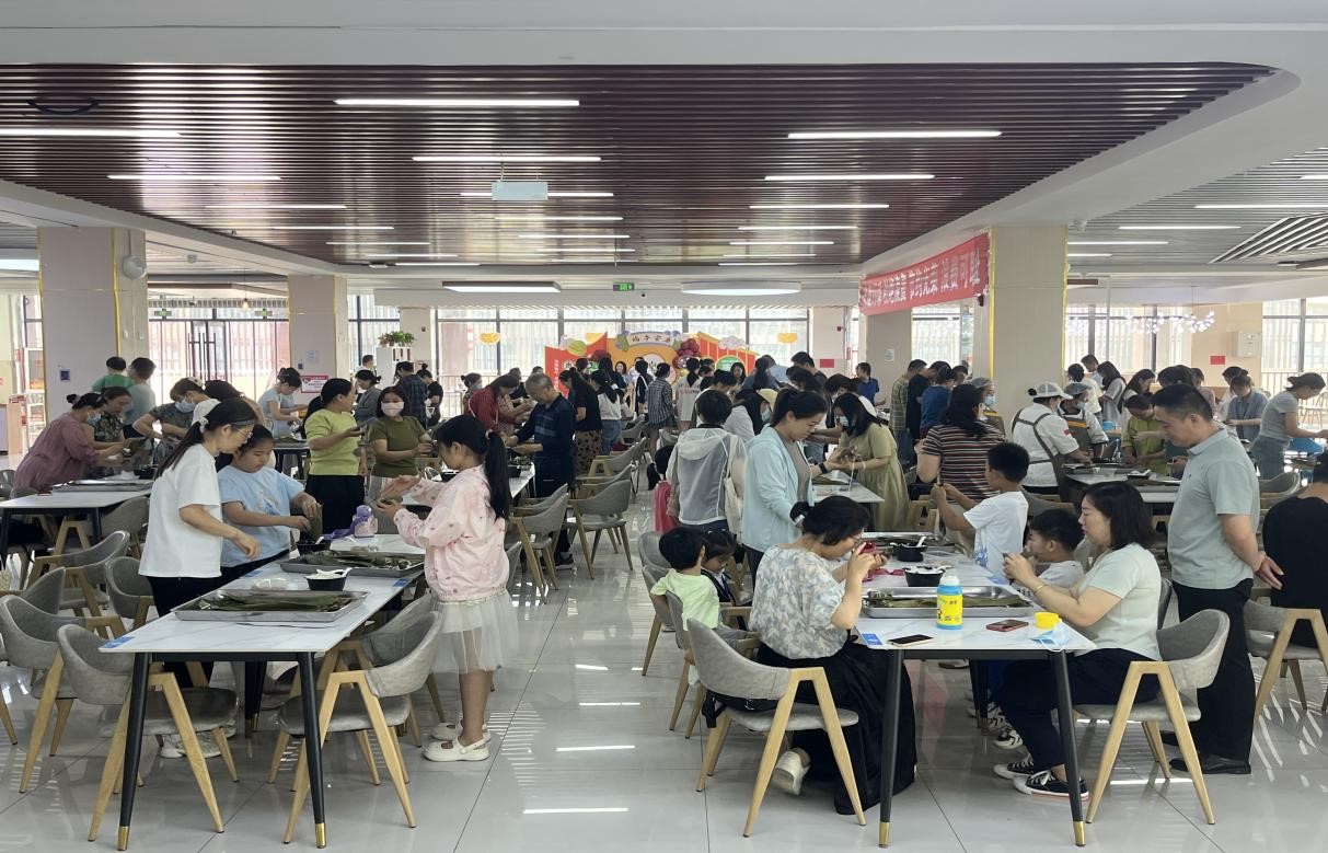 活动现场,后勤管理处邀请专业粽子制作师傅进行现场指导,手把手教授大家包粽子的技巧,到场的师生和孩子们跃跃欲试,捋粽叶、填糯米、放蜜枣、裹粽叶、扎线绳,一道道工序有条不紊,忙得不亦乐乎,形态各异的粽子纷纷呈现,大家互相展示着自己的成果,欢声笑语回荡在活动现场。