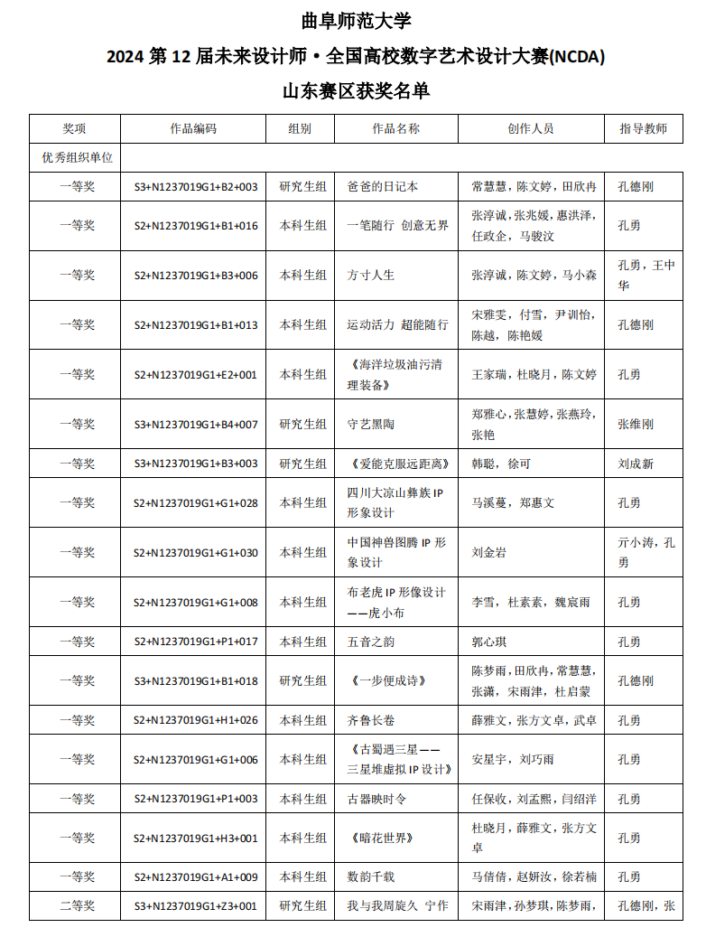 曲阜师大传媒学院讯 近日,第12届未来设计师·全国高校数字艺术设计大赛全国总评审结果和山东赛区评审结果揭晓。传媒学子在比赛中获全国奖项14件,其中一等奖3件,二等奖4件,三等奖6件,人气奖1件;在本届山东赛区中,获一等奖17件,二等奖13件,三等奖24件。