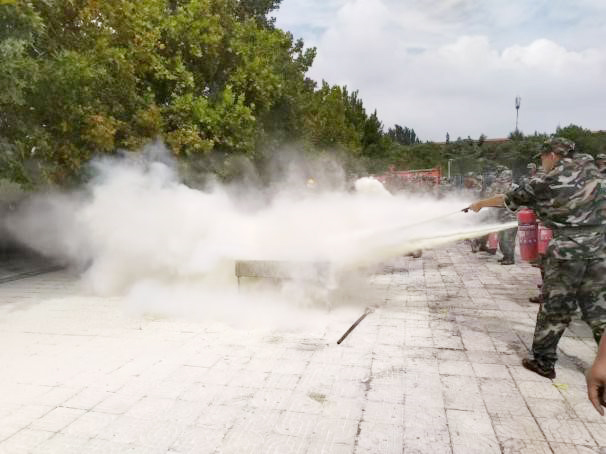 会后,消防官兵为同学们介绍了消防水带和干粉灭火器的使用方法和灭火要点,来自各军训连队的学生进行了实战演练。