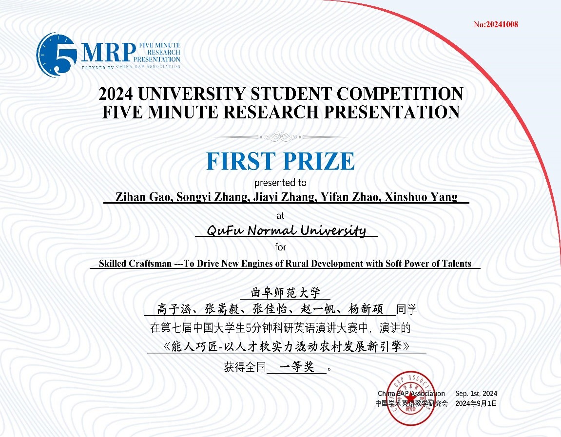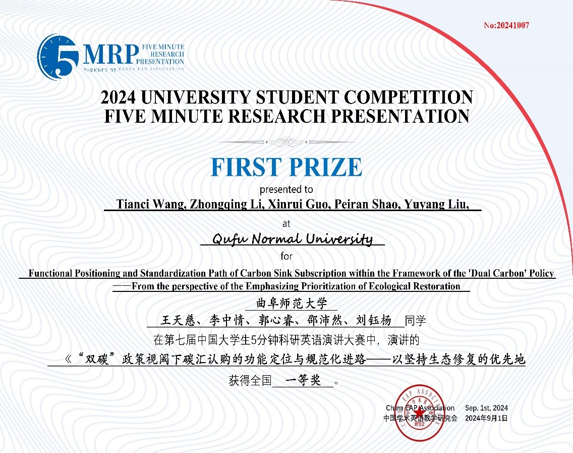 公共外语教学部讯 日前,第七届中国大学生5分钟科研英语演讲大赛决赛成功落下帷幕。由曲阜师大选拔推荐的39支团队在本次大赛中再创佳绩,获得全国一等奖2项、二等奖8项、三等奖12项、优胜奖17项。其中,由王天慈、李中情、郭心睿、邵沛然、刘钰杨等同学组成的团队作品“Functional Positioning and Standardization Path of Carbon Sink Subscription within the Framework of the ‘Dual Carbon’ Policy —— From the perspective of the Emphasizing Prioritization of Ecological Restoration”和由高子涵、张嵩毅、张佳怡、赵一帆、杨新硕等同学组成的团队作品“Skilled Craftsman ——To Drive New Engines of Rural Development with Soft Power of Talents”荣获全国一等奖。