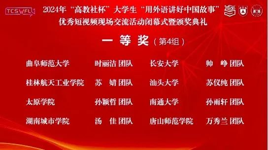 曲阜师大外国语学院讯 近日,由中国英汉语比较研究会指导,南京大学、湖南大学主办,高等教育出版社协办的2024年“高教社杯”大学生“用外语讲好中国故事”优秀短视频现场交流活动举办。曲阜师大外国语学院2022级英语师范生时丽洁及其团队成员张立鑫、陈佳悦、董雨琦在吉锡媛和刘萍老师指导下荣获山东省特等奖、国家级一等奖,华体会(中国)获优秀组织奖。