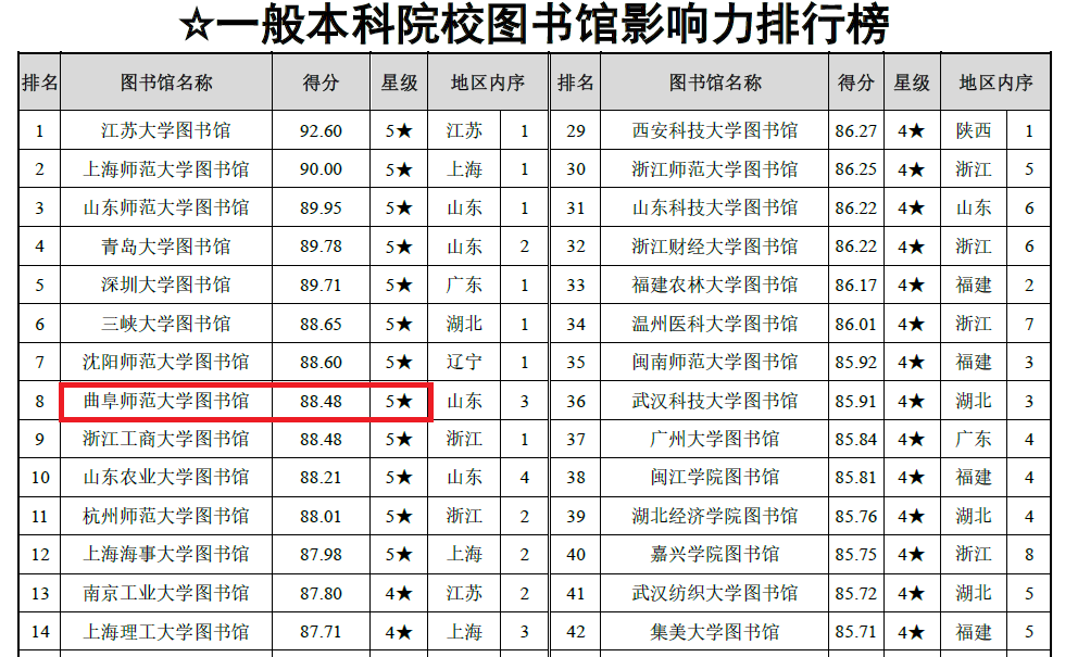 据悉,《数智时代中国图书馆影响力评价报告(2024)》是对全国2820所普通高校图书馆进行的综合性评价,报告严格按照基础实力、网站影响力、新媒体影响力、社会影响力和学术影响力5个一级指标和21个二级指标进行权重评分。目前,曲阜师大图书馆已构建起了两地三馆一体化智慧管理和服务新体系。通过多样化空间布局、数字化智能设备、智慧管理和服务等全方位推进“未来学习中心”建设;通过整合学校各类学习资源,融合新一代信息技术,打造了支撑学习方式变革的新型学习组织,打造了学校教学科研服务新高地。下一步,图书馆将致力于智慧化转型,不断为读者提供数字化、智能化、专业化、特色化和个性化服务,高质量满足广大师生教学科研对文献和空间的需求。
