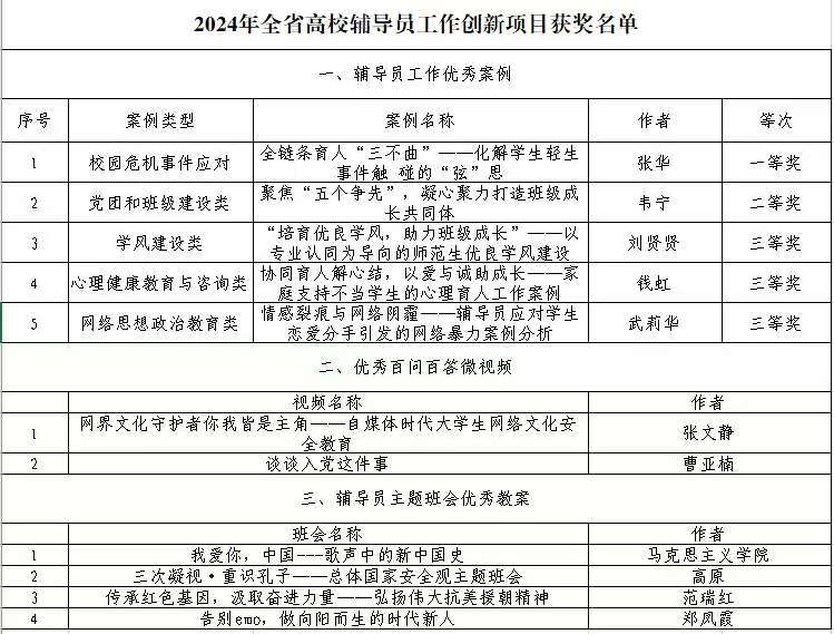 此次创新项目评选共分辅导员工作优秀案例、优秀百问百答微视频、辅导员主题班会优秀教案三个大类。曲阜师大在辅导员工作优秀案例中获得一等奖、二等奖各1项,三等奖3项。其中工学院张华《全链条育人“三不曲”——化解学生轻生事件触碰的“弦”思》案例获得一等奖,数学科学学院韦宁《聚焦“五个争先”,凝心聚力打造班级成长共同体》案例获得二等奖,历史文化学院刘贤贤《“培育优良学风,助力班级成长”——以专业认同为导向的师范生优良学风建设》、心理学院钱虹《协同育人解心结,以爱与诚助成长——家庭支持不当学生的心理育人工作案例》、传媒学院武莉华《情感裂痕与网络阴霾——辅导员应对学生恋爱分手引发的网络暴力案例分析》案例获得三等奖。在优秀百问百答微视频评选中,政治与公共管理学院张文静《网界文化守护者你我皆是主角——自媒体时代大学生网络文化安全教育》、教育学院曹亚楠《谈谈入党这件事》入选。在辅导员主题班会优秀教案评选中,学校共有1项集体作品、3项个人作品获奖。其中,马克思主义学院《我爱你,中国——歌声中的新中国史》获得集体作品奖励,文学院高原《三次凝视·重识孔子——总体国家安全观主题班会》、网络空间安全学院范瑞红《传承红色基因,汲取奋进力量——弘扬伟大抗美援朝精神》、法学院郑凤霞《告别 emo,做向阳而生的时代新人》获得个人作品奖励。