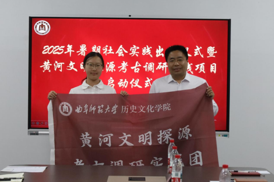 仪式由学院团委书记刘贤贤主持。历史文化学院党委副书记王建阳在发言中总结了学院多年来在社会实践工作中取得的丰硕成果,强调了实践育人的重要意义,叮嘱即将出征的学子在实践中要注重安全、协调配合,以扎实行动增强活动实效;历史文化学院副院长吕厚轩宣读了2025年国家级志愿服务团队立项名单;文物与博物馆学教研室主任陈德洋介绍了黄河文明探源考古调研实践项目的具体实施方案,为参与师生明确了工作目标和实施路径。学生代表王锦涛作表态发言,表达了青年学子投身实践、探索求知的坚定决心。
