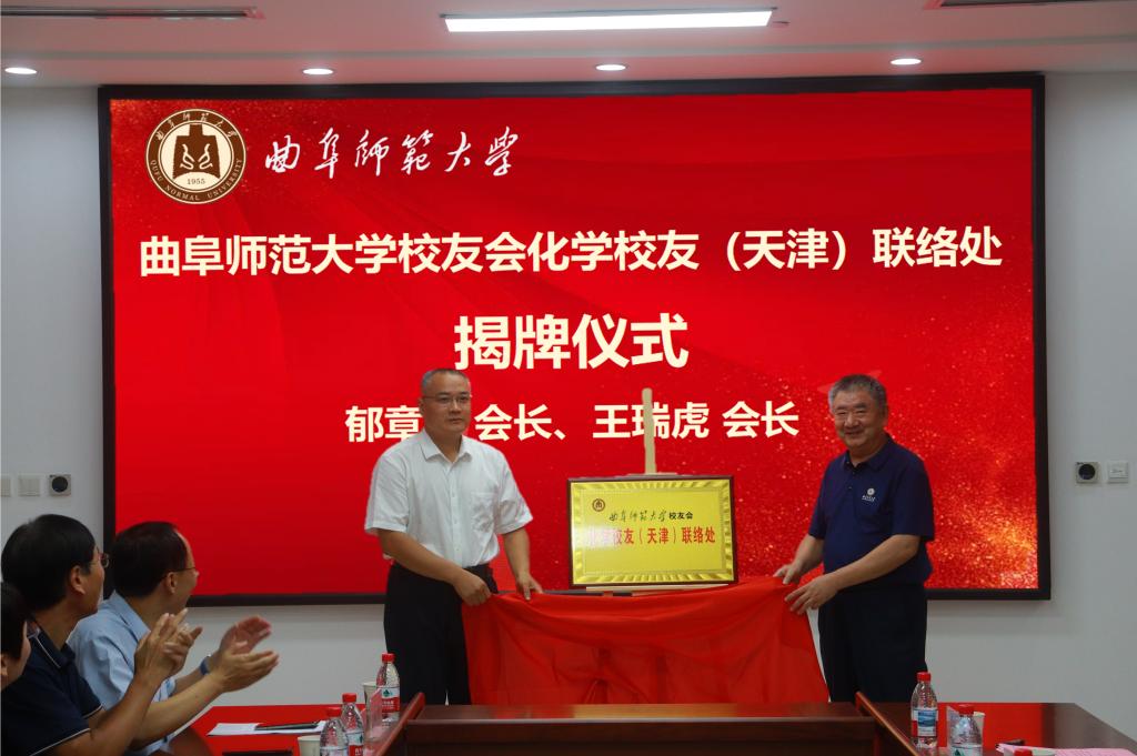 华体会(中国)校友会化学与化工学院分会会长郁章玉和王瑞虎共同为化学校友(天津)联络处揭牌。