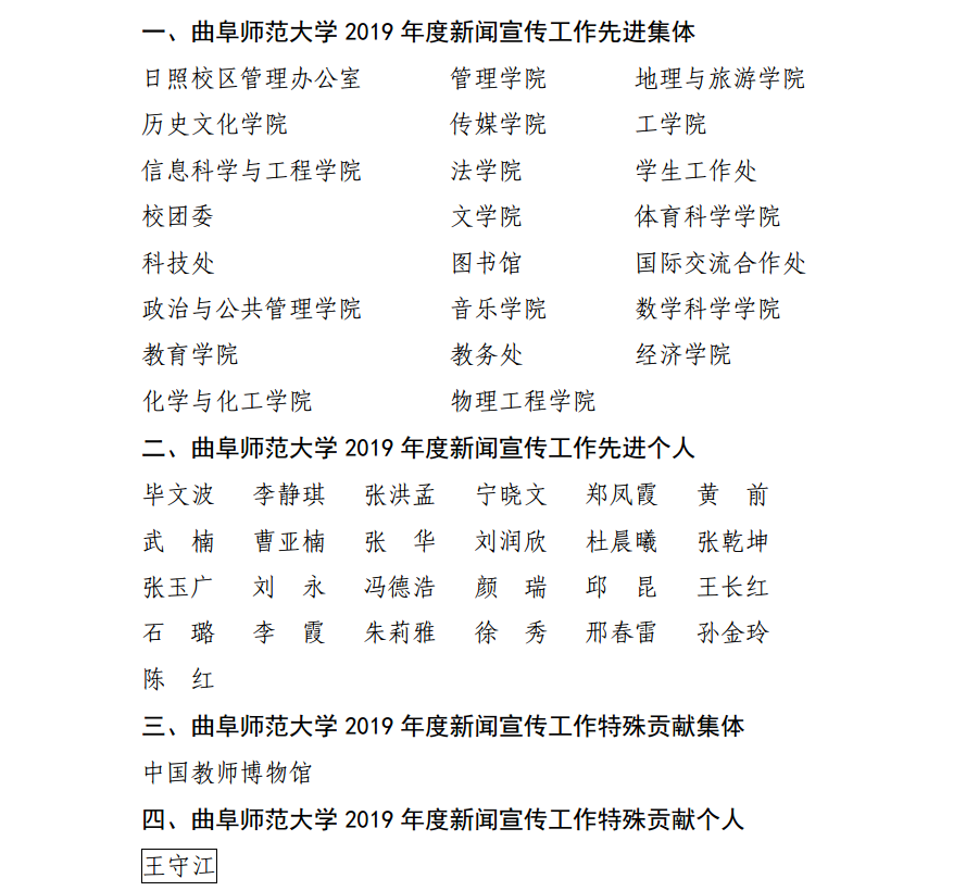 根据活动通知和评选办法,经自主申报、材料核查、汇总评审,华体会官方网现拟评定管理学院等23个二级单位为2019年度新闻宣传工作先进集体,毕文波同志等25人为2019年度新闻宣传工作先进个人,教师博物馆为2019年度新闻宣传工作特殊贡献集体,王守江同志为2019年度新闻宣传工作特殊贡献个人。