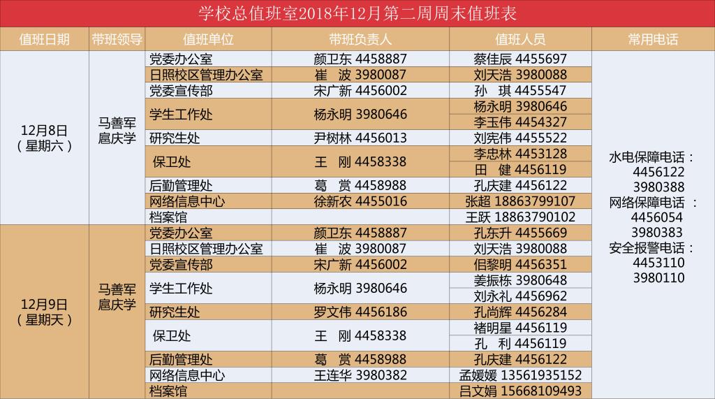 学校总值班室2018年12月第二周周末值班表