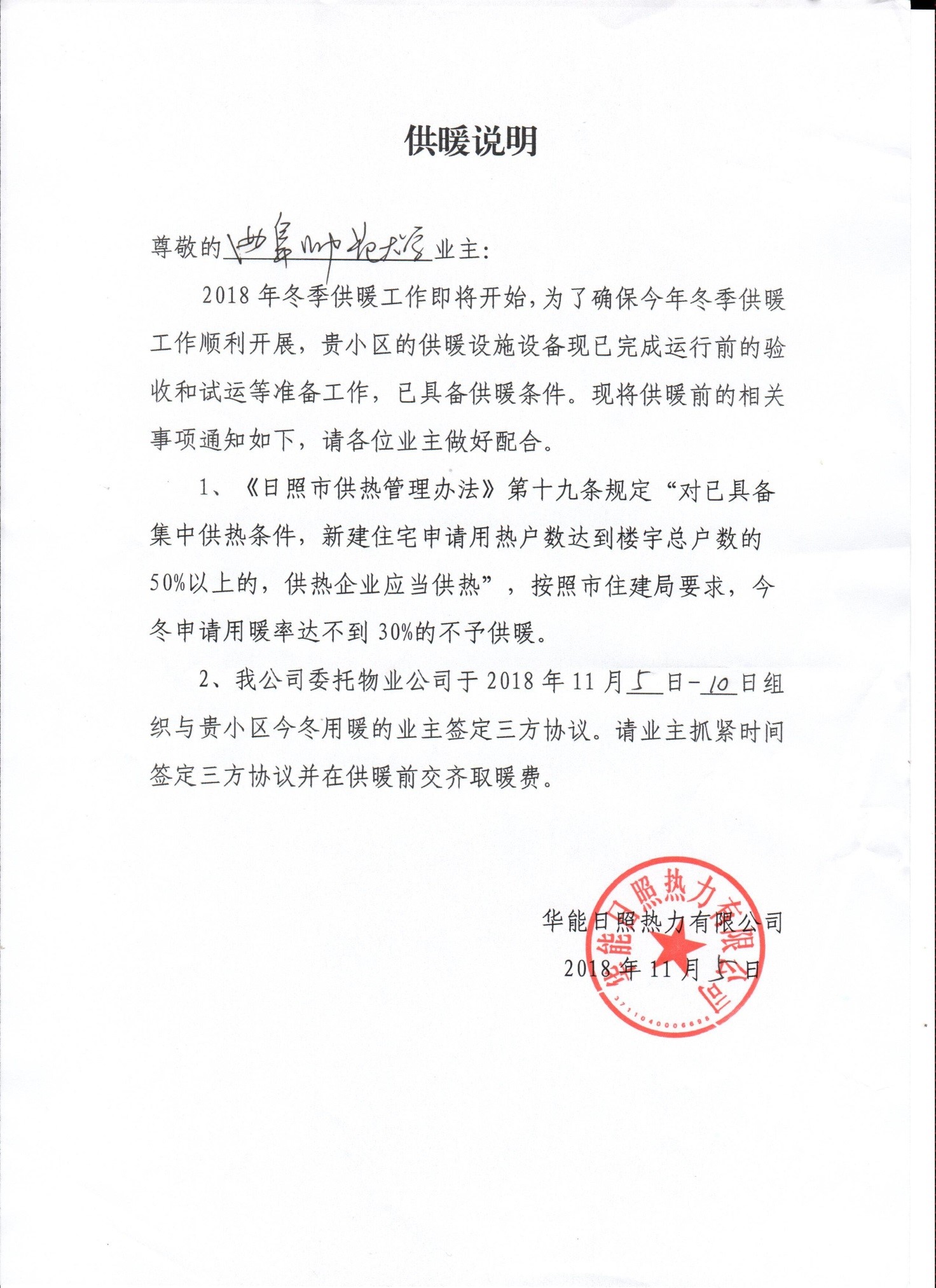 根据华能日照热力有限公司通知,今年新入网供暖的住户需要和热力公司签定《新入网小区供暖临时协议》,具体通知如下: