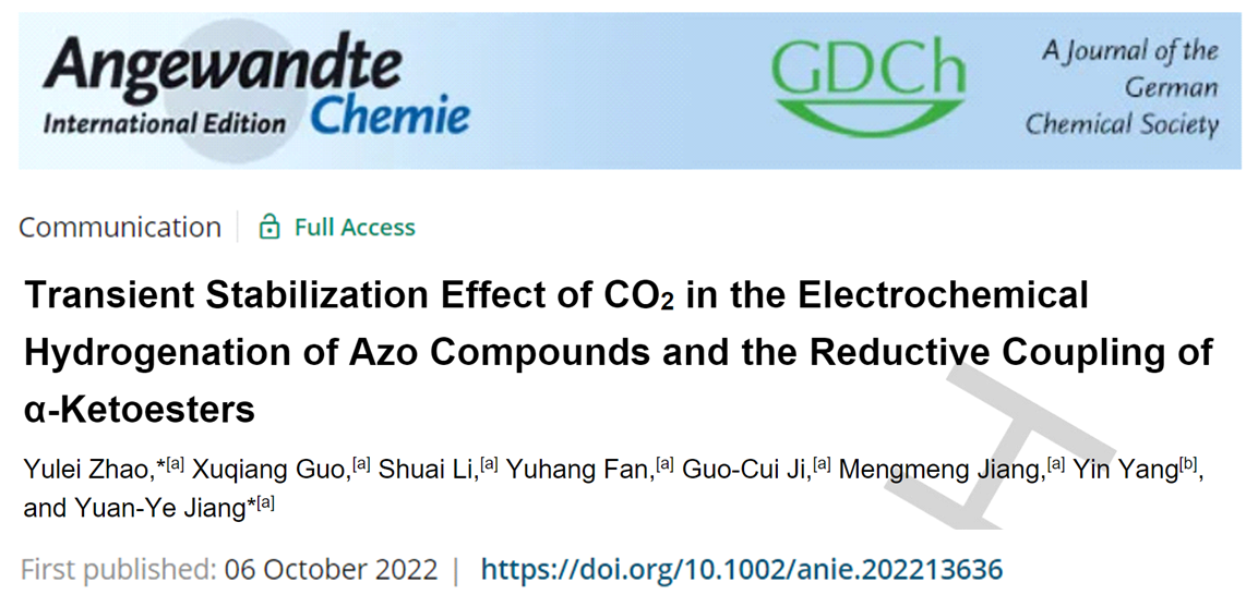 曲阜师大科技处讯 近日,曲阜师大化学与化工学院赵育磊副教授与蒋原野副教授合作,在二氧化碳利用领域取得突破性进展,相关研究成果发表在国际顶级期刊《德国应用化学》(Angewandte Chemie International Edition)上,论文题为“Transient Stabilization Effect of CO2 in the Electrochemical Hydrogenation of Azo Compounds and the Reductive Coupling of α-Ketoesters” (DOI: 10.1002/anie.202213636,文章链接:https://onlinelibrary.wiley.com/doi/10.1002/anie.202213636)。华体会(中国)为该论文的唯一通讯单位,赵育磊副教授为该论文的第一作者和通讯作者,蒋原野副教授为该论文的共同通讯作者。《德国应用化学》于1962年由John Wiley and Sons Ltd出版,是化学和材料领域的国际顶级期刊。JCR分区为一区,当前影响因子为16.823。